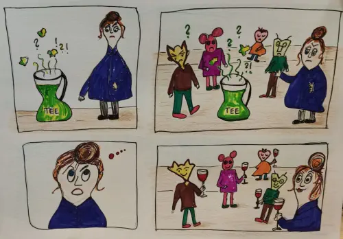 Angefangen mit kurzen Skizzen entstehen nach und nach (Comic-)Figuren, die schattiert und koloriert werden. Wie kann man Gefühle mit einfachen Mitteln darstellen und die Figur in Szene setzen? Am Ende haben Sie verschiedene Möglichkeiten, Ihr eigenes Comictagebuch zu gestalten. Durch das Erfinden und Weiterentwickeln einer Figur können Gedanken und Gefühle auf kreative Weise ausgedrückt, dokumentiert und reflektiert werden. Hier können Sie dokumentieren, was Sie gemacht haben oder gerne machen würden. Sie können sich damit von Ihrer Arbeit erholen oder vielleicht auch Ärgernisse in humorvolle gezeichnete Szenen umwandeln und neue Perspektiven gewinnen.